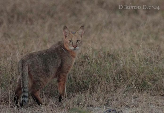 It has long legs and a comparatively short tail. Its light green eyes send a chill down the spine. This cat is yellowish grey in colour with paler undersides. The ears are reddish with pencil-like black hair. The paws are black underneath. It prefers grasslands and open scrub jungles. It hunts during the mornings and evenings. The average weight is 5-6 kg and it is capable of bringing down prey much larger than its size. Its tail has black rings towards the end and ends in a black tip.