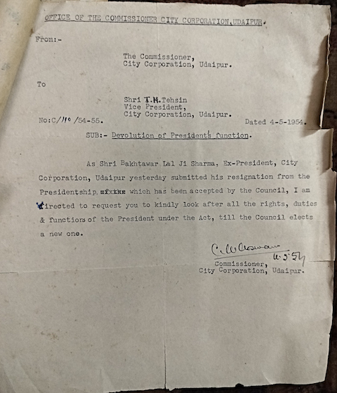 In 1948, under the Mewar state constitution, a seat reserved for the director of a limited company was set to be filled. T.H. Tehsin was unanimously nominated by both Mewar Praja Mandal, an ally of Nehru’s Congress due to their Gandhian thought, and the opposition Shetriya Parishad. He was urged to convert his business to a private limited company and provided the support to do that. However, a tragic incident involving a firing at a Praja Mandal rally led to the cancellation of the elections, preventing Tehsin from taking office as a legislator.